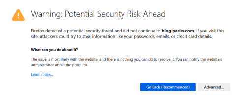 BAD CERT DOMAIN is not a good thing. Checking WHOIS, parler.com is still registered at Epik under Anonymous. BAD CERT refers to the certificate which has likely expired.