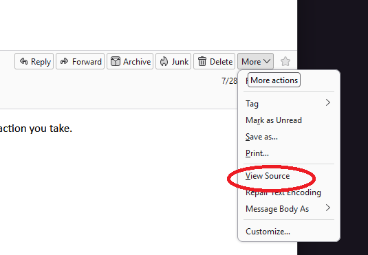 The scam is amplified further by the fact that the most common way it is presented is over a user’s cell phone. Cell phones are not designed to present information as extensively as a desktop PC. To solve this problem, you are best using a PC with your e-mail program. An e-mail program, such as Thunderbird, will present an extensive range of information regarding source data. Another option is to use your provider’s web mail service. The objective is to “View Source”, or to expose the “header” of the email message which will indicate the route it traveled to reach your e-mail account